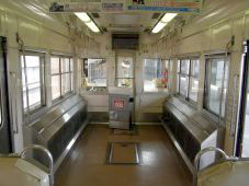 2扉2両のこの車両内に腰掛が両側にずらりと並んでいます。