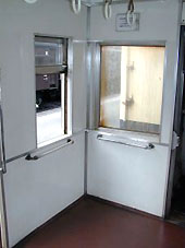 車両端部の出入扉は片開きの引き戸。ガラガラと音を立てて開きます。
