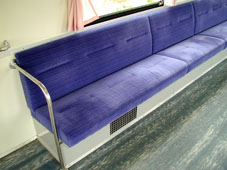 左右の鮮やかなブルーの表地の腰掛、そしてカーテンのピンク。