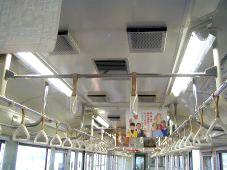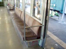 中間車車端部は薄緑色の妻壁、ロングシートが両側に展開しています。