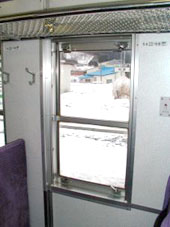 青森寄の車両端部の様子です。右はトイレですが、臭気または寒気対策でしょうか入り口はデッキ側にあります。