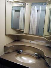 洗面台です。こちらも大理石調です。3面の大きな鏡が特徴ですよね。女性には嬉しいかも。