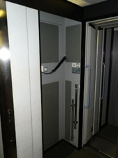 共用トイレ入口。こちらは車椅子も対応の大型仕様。